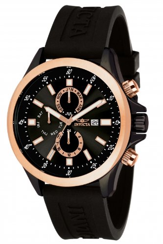 Well known for integrity and quality the Specialty collection by Invicta. Stainless steel case measures 45mm diameter by 13mm thick. Black genuine rubber strap includes a stainless steel buckle. Black tone dial has luminous hands. Day and date display at the third hour. The precise Quartz movement is protected by a scratch resistant Flame Fusion crystal. Water resistant to 100 meters.