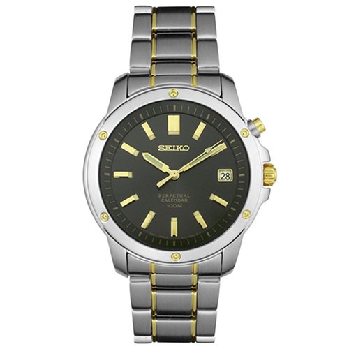 Seiko Men's Perpetual Calendar Stainless Steel Watch Choices: Two-tone / black, gold-tone / white or two-tone / blue Select from your choice of a silver-tone or gold-tone stainless steel case with a matching bezel. Hardlex crystal shields your choice of a black, blue or white dial characterized with a date window at 3:00, with gold-tone luminous index markers at all remaining hour positions. Distinguishing marks include "Seiko" scripted below 12:00 with "Perpetual Calendar 100M" above 6:00. Bracelet: Stainless steel Movement: Japanese Seiko perpetual calendar quartz Crystal: Hardlex Crown: Push / pull Clasp: Push button deployant Bracelet Measurements: 8-1/4" L x 19mm Case Measurements: 39mm /li> Water Resistance: 10 ATM - 100 meters - 330 feet Model Numbers: Two-tone / black: SNQ046 Gold-tone / white: SNQ012 Two-tone / blue: SNQ012 Warranty: Three year limited warranty provided by Seiko Corporation of America. Additional Features: Watch comes packaged in a Seiko watch box with instruction manual and warranty information. ShopNBC is an authorized dealer of Seiko watches. Perpetual Calendar: Once set, the calendar automatically adjusts for odd and even months including February of leap years up to February 28, 2031.A handsome, traditional men's bracelet watch, the Arctura would be the watch a father hands down to a son, if he had done very well. gold-tone stainless steel accents on the bezel and dial suggest a degree of elegance in this otherwise conservative timepiece. The watch features a circular, jet black dial with gold-tone indexes and gold-tone Lumibrite hands. A perpetual date calendar at the three o'clock position is easy to read. The watch has no numerals, but the indexes, gold-tone stainless steel for hours and gold-tone marks for minutes, stand out well on the dial. The polished stainless steel case features a screw-in case back. The band is stainless steel with pushbutton clasps. The watch has a hardlex crystal. It is water resistant to 165 feet (50 meters).