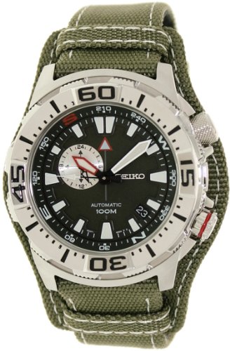 Stainless steel case with a green nylon canvas strap. Uni-directional rotating stainless steel bezel. Army green dial with luminous hands and index hour markers. Minute markers. Compass scale around the outer rim. Dial Type: Analog. Luminescent hands and markers. Date display between 4 and 5 o'clock positions. 24 hour sub-dial at the 9 o'clock position. Automatic movement. Scratch resistant Hardlex crystal. Transparent case back. Case diameter: 42 mm. Case thickness: 13 mm. Round case shape. Band width: 22 mm. Tang clasp. Water resistant at 100 meters / 330 feet. Functions: date, hour, minute, second, 24 hour. Casual watch style. Seiko Automatic Army Green Dial Green Canvas Mens Watch SSA055.