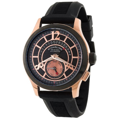 With dedication to the heritage of Swiss watchmaking, Stuhrling Original timepieces appeal to the most discriminating taste at reasonable prices. The company has roots dating back to the 1800's when Switzerland emerged as the global leader in watchmaking. Stuhrling Original remains committed to its mission of preserving the high standards set in Switzerland manufacturing all of their fine timepieces in their Swiss-owned factory! Each and every model conveys an inimitable story with extraordinary style. You'll find heirloom selections for both men and women that even the most astute watch collector will cherish and admire. Each Stuhrling Original dial has been designed to enable optimal read-off at a glance, while adding an element of artistic design, and the Stuhrling Original cases are distinguished by their technical complexity, their high-end aesthetic appeal and the quality of their finish. The watch cases are made from antimagnetic 316L surgical grade stainless steel, an extremely sophisticated alloy designed to stand up to intensive use.Celebrate the solar eclipse everyday with the Stuhrling Original Men's 247.3324B61 Leisure Gen-X Baily Automatic Retrograde Day And Date Rubber Strap Watch. The polished rose-gold-tone stainless steel case and beveled black bezel complement the rose-gold-tone accented dial. A handsome black dial features a dramatic rose-gold-tone eclipse design along with rose-gold-tone Arabic numerals displayed at the four, eight, and 12 o'clock hours. Sharp rose-gold-tone luminous hour, minute, and second hands are accompanied by rose-gold-tone red-tipped date and day hands. The date is displayed in a crescent toward the center of the dial, and a rose-gold-tone day subdial appears at the six o'clock position. An outside minute track features triangular luminous indices at each hour position. The black rubber strap fits comfortably and fastens securely with a buckle clasp. This timepiece relies on automatic-self-wind movement and is protected by a synthetic sapphire crystal. The watch is water resistant to a depth of 165 feet (50 meters).