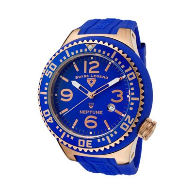 The Neptune Collection launched in 2009, and ever since has proven to be one of Swiss Legend’s favorite timepieces. A standout feature, like the silicone rubber ring that protects the unidirectional rotating bezel is what identifies this collection. The robust 52mm case gives the Neptune Collection its uniqueness. A textured rubber strap, in matching color, and off-set crown add to the lure of this exciting and high quality timepiece.